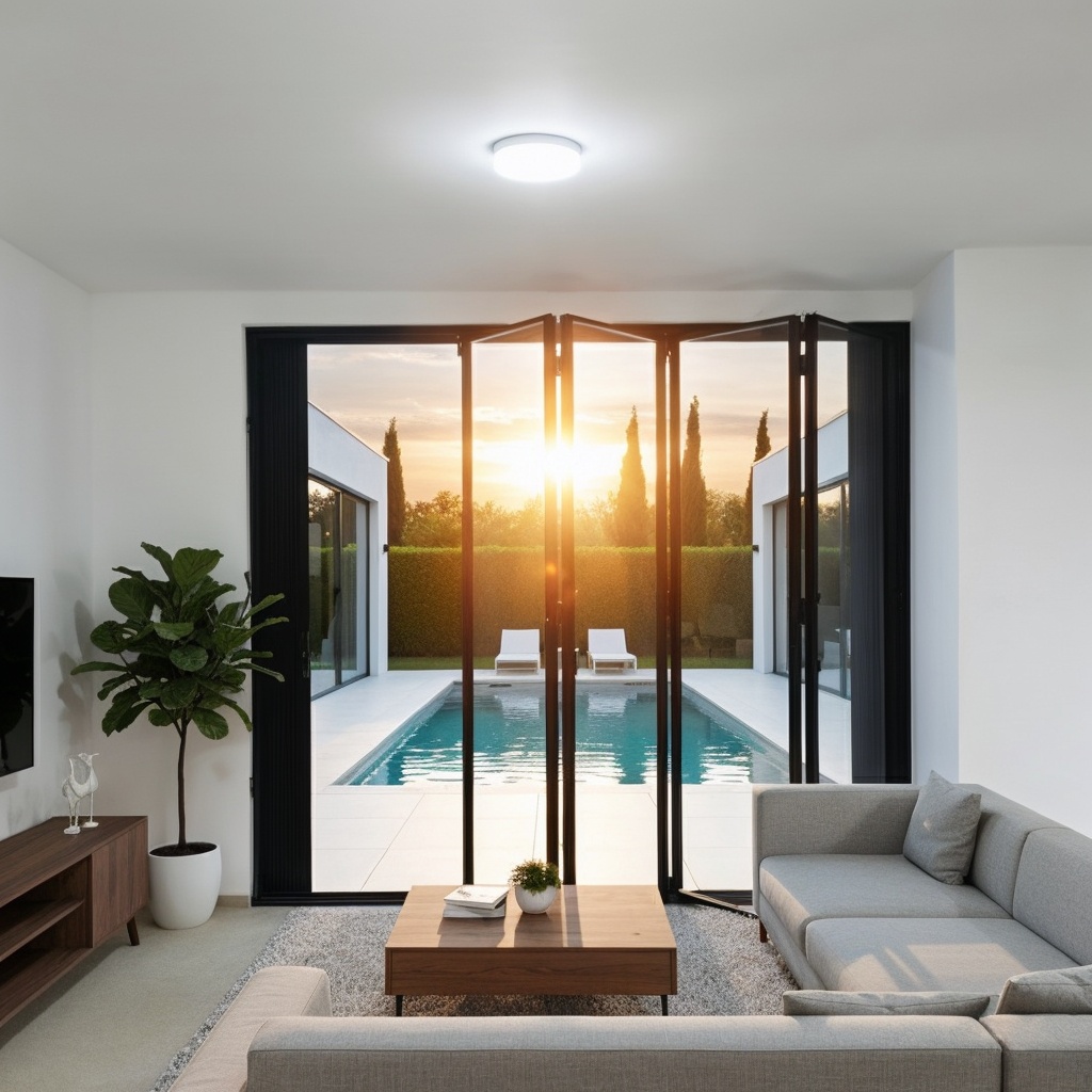 A panoramic façade with a traditional Folding system, extending fully from floor to ceiling to provide a practical solution that combines elegance with flexibility.