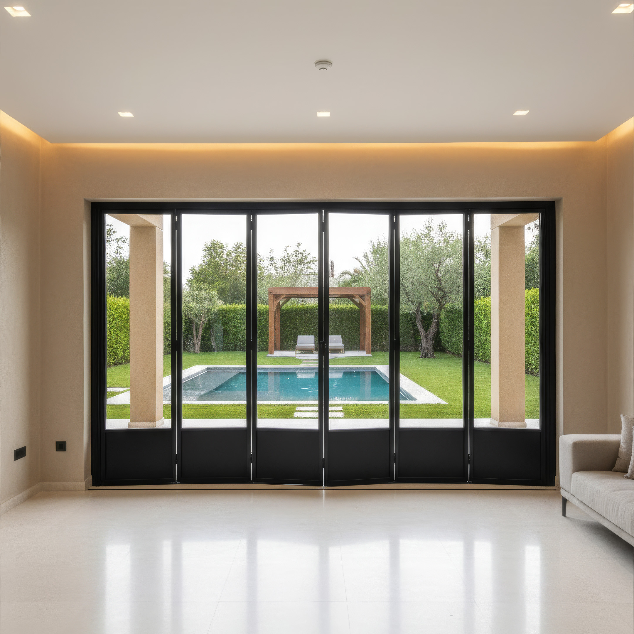 All accessories are manufactured from high-quality aluminum and include top load rollers, concealed folding hinges between panels, recessed integrated handles, and an integrated locking system. The concealed floor guide incorporates alignment elements to ensure smooth and stable movement. All hardware is fully concealed within the aluminum profiles to maintain a clean architectural appearance.