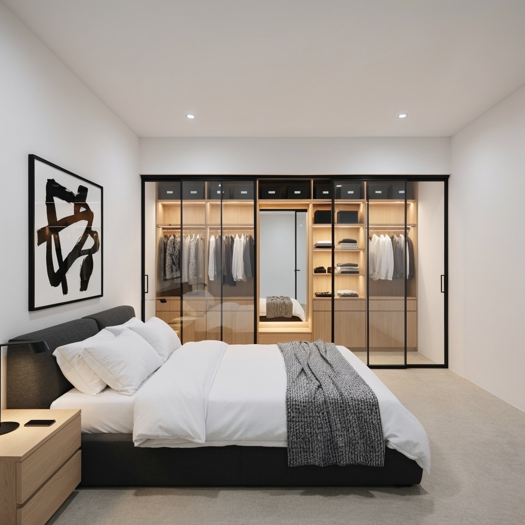 This system is the ideal solution for refined interior spaces such as dressing rooms or modern glass partitions, combining functionality with a contemporary design.